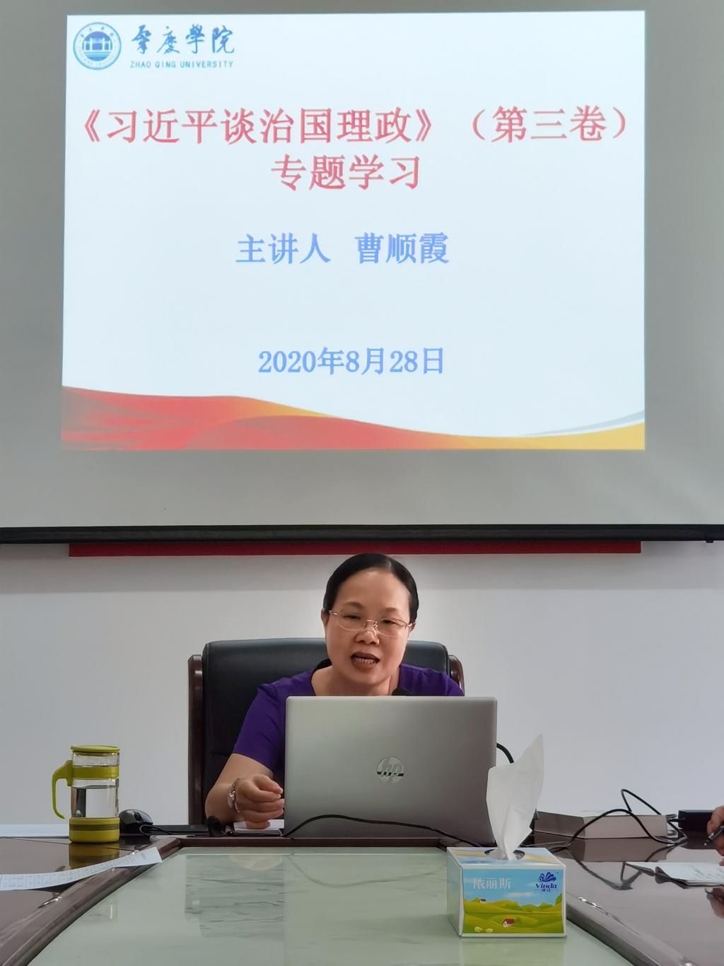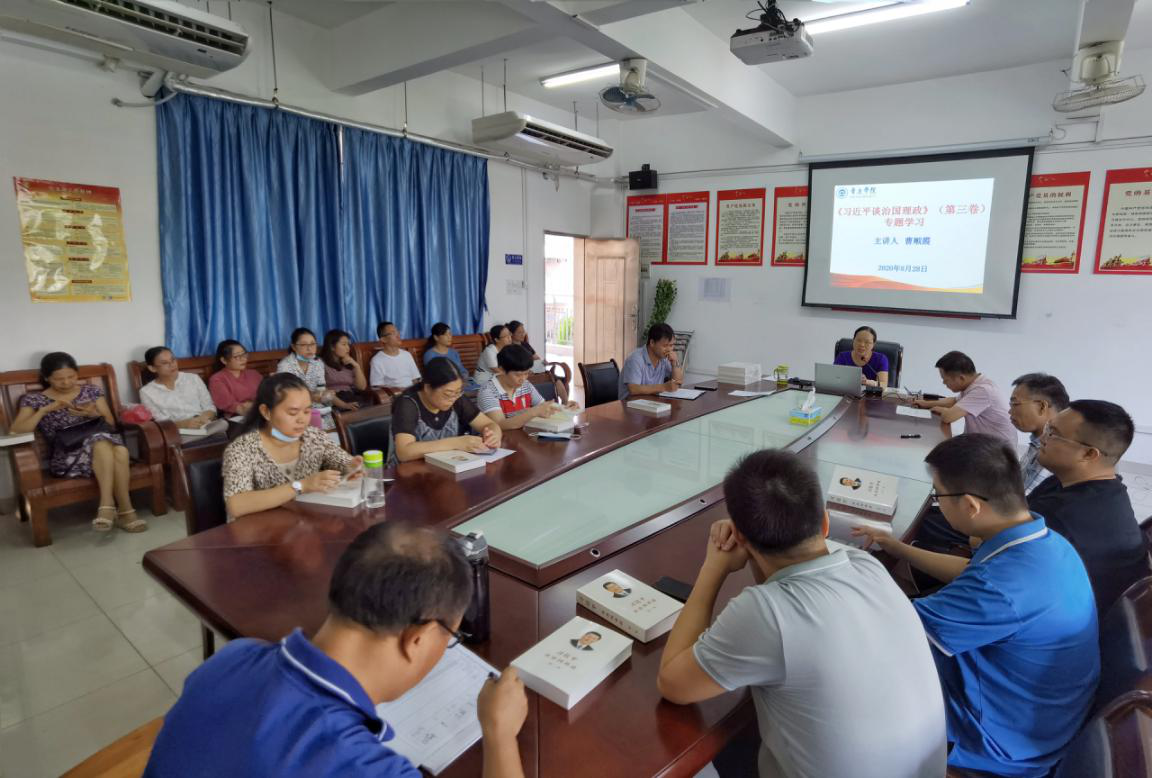 为了更好地让学院全体教师认真学习和领会《习近平谈治国理政》第三卷,28日上午我院全体教师进行了专题学习。会上,曹顺霞院长为大家作了专题讲座。通过学习,老师们一致表示,作为一名党员和思政课教师,一定要在平时多读原著、学原文、悟原理,以进一步做好习近平新时代中国特色社会主义思想进教材进课堂进学生头脑工作。