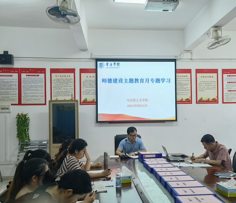 为深入学习贯彻习近平新时代中国特色社会主义思想,学习习近平总书记在党史学习教育动员大会、庆祝中国共产党成立100周年大会上的重要讲话精神,不断推进我院教师的师德师风建设以及纪律教育学习,我院全体教师于9月15日下午在会议室进行了师德建设主题教育月专题学习和纪律教育主题学习月专题学习。