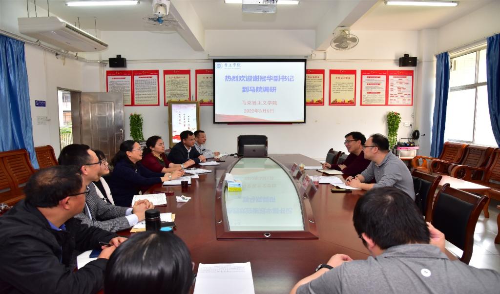 谢冠华副书记充分肯定了马院多年来取得的成绩,认为马院在思想政治理论课改革创新方面取得了实效,特别是在党史学习教育中形成了特色,有成效。同时强调,马院工作任务重、责任大,在今后工作中,一是要高标准、高质量推进思政课改革,充分利用网络资源、新媒体手段,在改进中提升,提升中改进;二是要深刻把握习近平总书记对思政课建设要求,学深学透上级文件精神,按照国务院、中宣部、教育部等的顶层设计谋划马院发展;三是要加强马院教师队伍建设,配齐建强专职思政课教师,确保今年学校思政课教师师生比达到1:350,要加强教师培训研修工作,特别是青年教师培养。