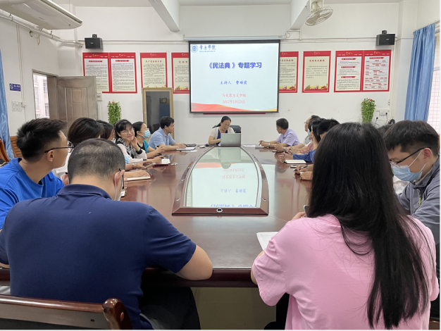 本网讯 2022年5月是《中华人民共和国民法典》施行以来的第二个“民法典宣传月”。为提升williamhill威廉希尔官网全体教师的法治素养,2022年5月23日williamhill威廉希尔官网开展了“《民法典》专题学习”活动,马院院长曹顺霞、副院长曹和修及相关教师参加了此次活动。