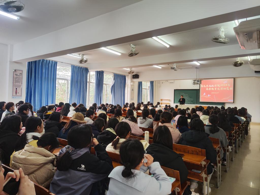 高春海、方拥香就实习安排、实习要求、实习管理、鉴定考核等方面做了解释说明。辅导员和班主任就实习安全、师德师风等方面做了再部署、再强调。