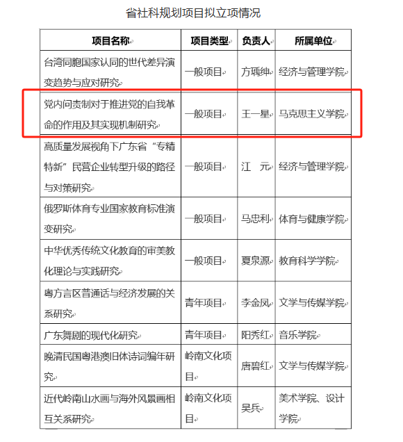 近日,广东省社科规划2024年度常规项目及三类研究专项的立项名单公布。我院王一星老师的课题《党内问责制对于推进党的自我革命的作用及其实现机制研究》获批立项。