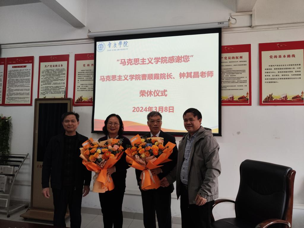 曹顺霞教授、钟其昌副教授分别发表了荣休感言。他们深情回顾了与大家共事的难忘时光,饱含着对学院的无限热爱与眷恋,同时感谢学院的真切关怀,衷心祝愿学院未来的发展再上新台阶、再创新辉煌。他们嘱咐年轻教师,要扬师德,铸师魂,潜心教书育人,坚守三尺讲坛。