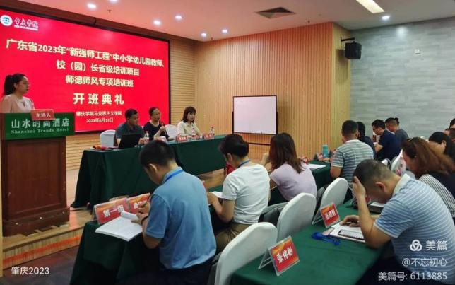 本网讯 6月12日,2023年广东省中小学幼儿园教师、校(园)长省级培训项目师德师风专项培训班顺利开班。肇庆学院williamhill威廉希尔官网院长曹顺霞、副院长曹和修,培训班班主任williamhill威廉希尔官网教师刘琼,以及来自全省各地市的中小学骨干教师齐聚肇庆,共同参加了开班仪式。