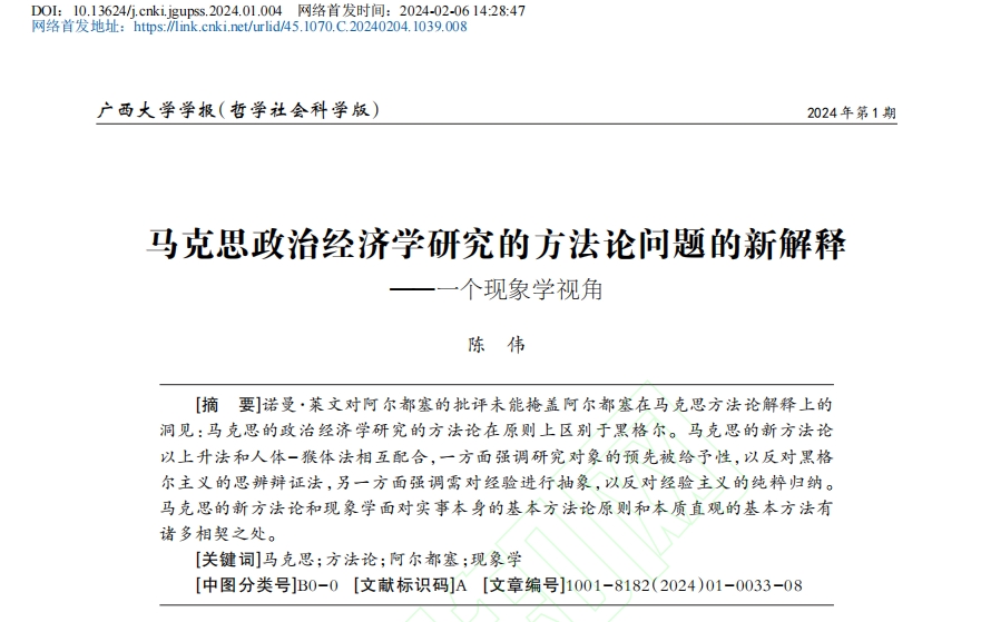 本网讯 2024年第1期《广西大学学报》(哲学社会科学版)发表了我院陈伟教授的论文《马克思政治经济学研究的方法论问题的新解释——一个现象学视角》。