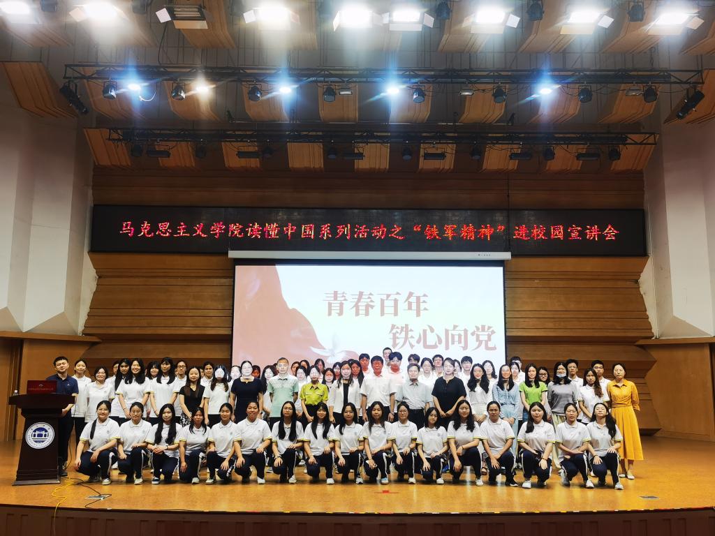 在这场特别的思政课活动中,刘芳主任以《青春百年 铁心向党》为题,首先通过团队活动之“重走铁军路”作为切入,组织学生参与到思政课堂,在参与的过程中感悟团结协作的力量,进而感受铁军为祖国的解放、人民的幸福一路浴血奋战的艰辛过程。刘芳主任通过对叶挺独立团建团的历史,以及在新民主主义革命时期、社会主义革命和建设时期、改革开放和社会主义时期铁军为祖国所作出的贡献进行了系统的讲述。最后,刘芳主任援引老英雄陈卓熙同志的口述历史回顾,让同学们了解这位战斗英雄的故事,进而引发学生对当代青年的责任与使命担当的思考。