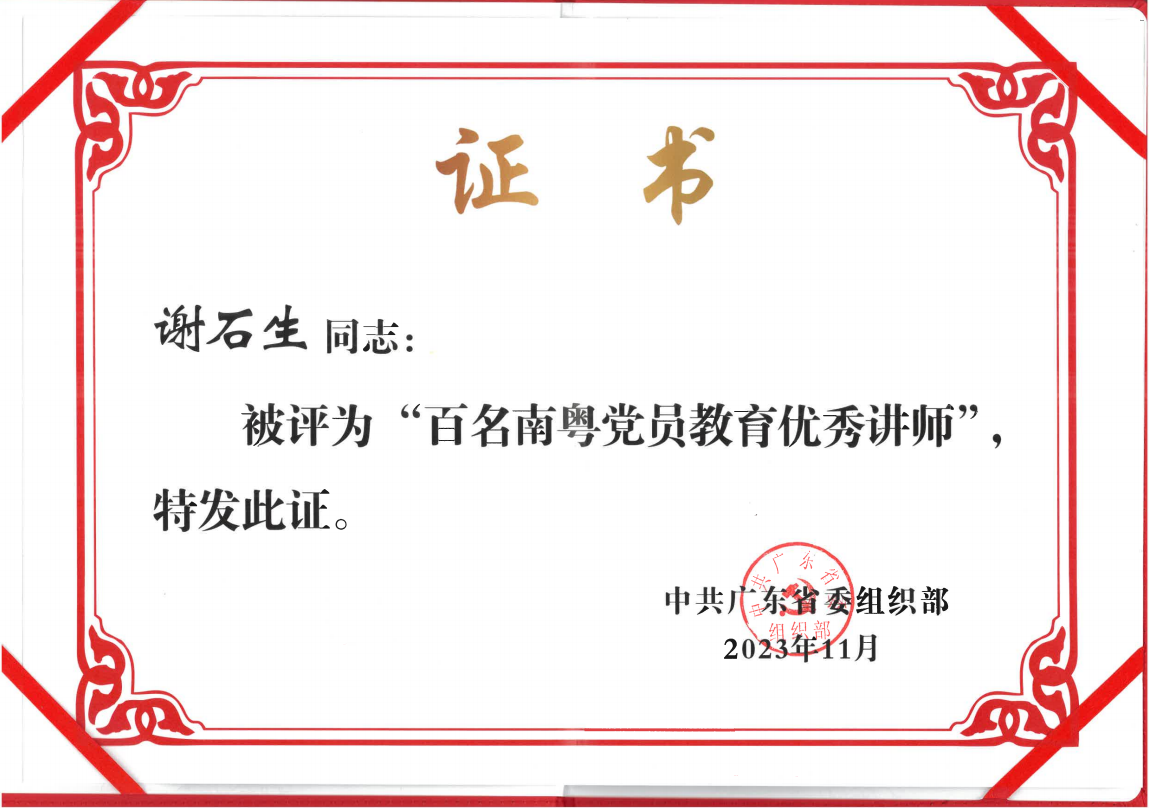 此次入选“百名南粤党员教育优秀讲师”,是对谢石生老师开展党员教育和理论宣讲工作的肯定,也是对学校党的创新理论的宣传宣讲工作的肯定。