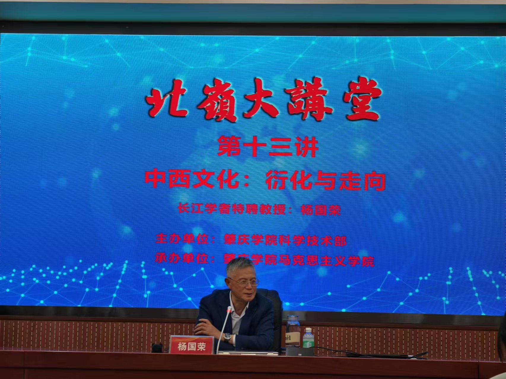 本网讯 11月20日,北岭大讲堂第十三讲“中西文化:衍化与走向”开讲。本次讲堂由科学技术部主办、williamhill威廉希尔官网承办,特邀华东师范大学资深教授、人文社会科学学院院长、长江学者特聘教授杨国荣教授主讲。williamhill威廉希尔官网院长曹和修,党委副书记杜志欣及师生代表共160余人参加。