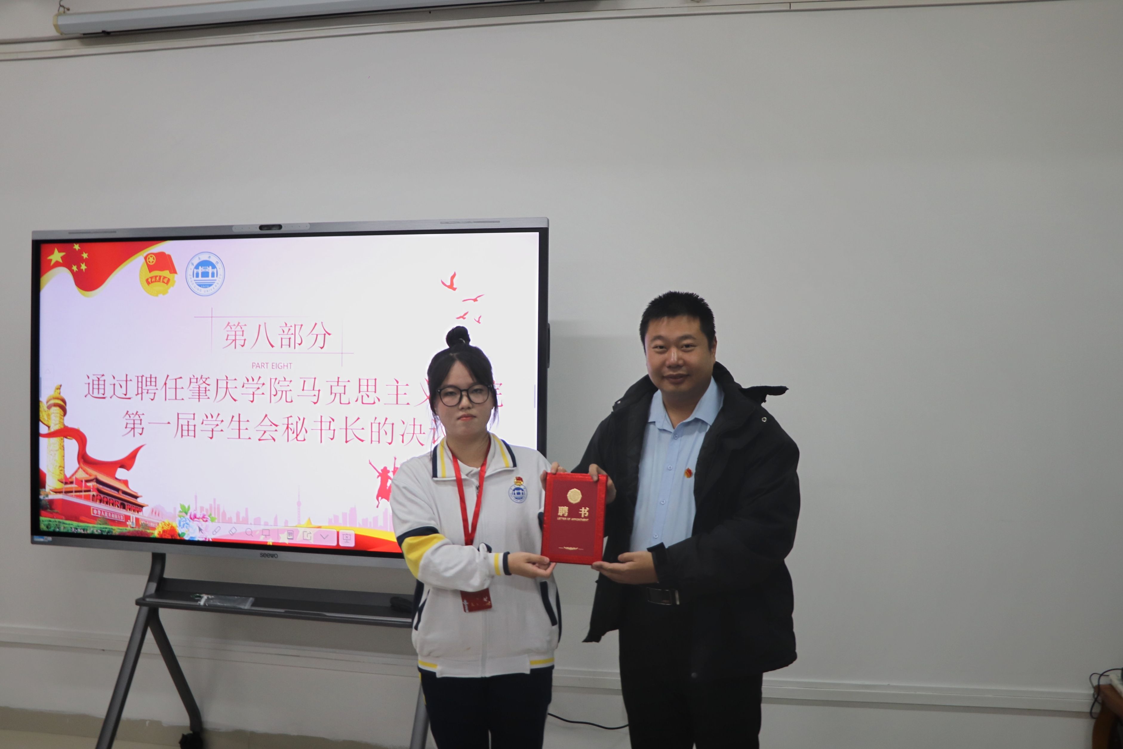 肇庆学院校学生会主席团成员王晓琦同学代表校学生会主席团向大家提出了两点愿景。一是要以习近平新时代中国特色社会主义思想为指导,始终保持和增强政治性、先进性和群众性。二是要恪守学生本分,牢记服务宗旨,永葆理想情怀。她希望新一届学生干部用实践凝聚初心和使命,做好学院与学生之间沟通的桥梁工作,塑造良好的组织形象,为学校的发展和学院学生会的建设书写浓墨重彩的篇章。