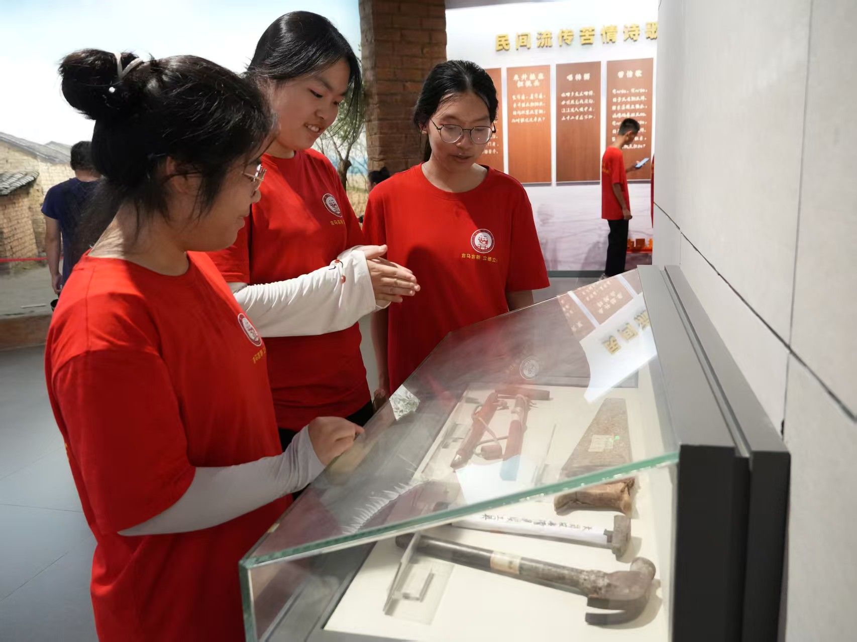 金鸡镇关爱留守儿童实践团队员们正在观看陈列的原始工具
