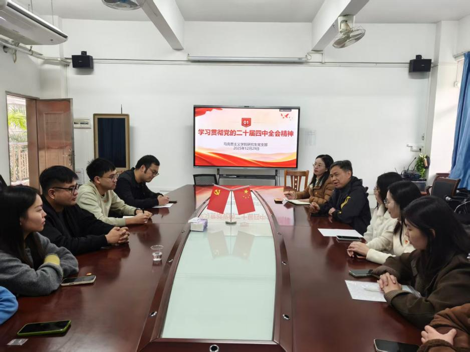 深学细悟全会精神活动伊始,研究生党支部在三教317会议室召开了专题学习会,集中学习贯彻党的二十届四中全会精神。学院党委书记候玉基对全会精神进行领学解读,他紧扣全会精神实质,结合马克思主义理论学科特色和研究生党员成长发展需求,系统解读了全会关于“十五五”时期发展目标、高质量发展要求、全面从严治党等核心内容,深入阐释了全会召开的时代背景与重大意义,要求全体研究生党员要深刻领悟“两个确立”的决定性意义,切实把思想和行动统一到党中央决策部署上来,立足学术研究本职,将理论学习成果转化为服务国家发展大局的实际行动。党员们围绕全会公报中“十五五”时期发展目标、高质量发展要求、全面从严治党等核心内容展开深入研讨,深刻领悟“两个确立”的决定性意义,明确了新时代研究生党员在推进中国式现代化建设中的责任担当。大家纷纷表示,要将全会精神转化为学习科研的动力,把个人理想融入国家发展大局,以实际行动践行初心使命。