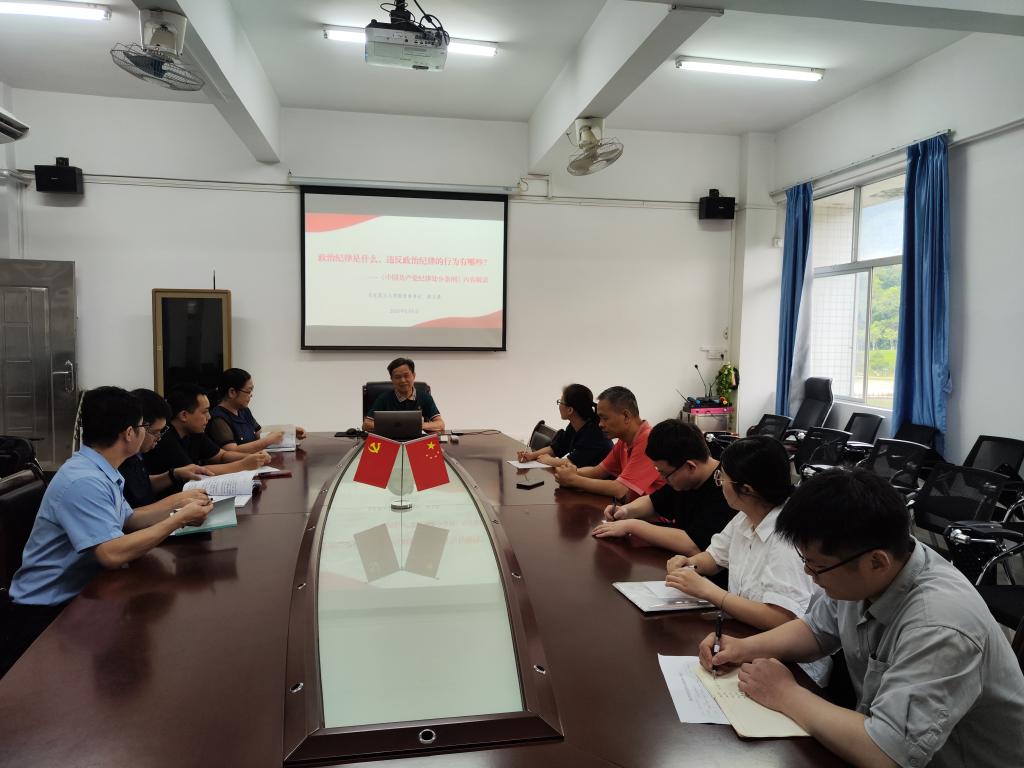 本网讯 为扎实开展党纪学习教育,6月6日上午,马院党委书记侯玉基在院会议室为“纲要”教学部教师党支部全体党员讲授了专题党课,主题为:政治纪律是什么,违反政治纪律的行为有哪些——《中国共产党纪律处分条例》内容解读。
