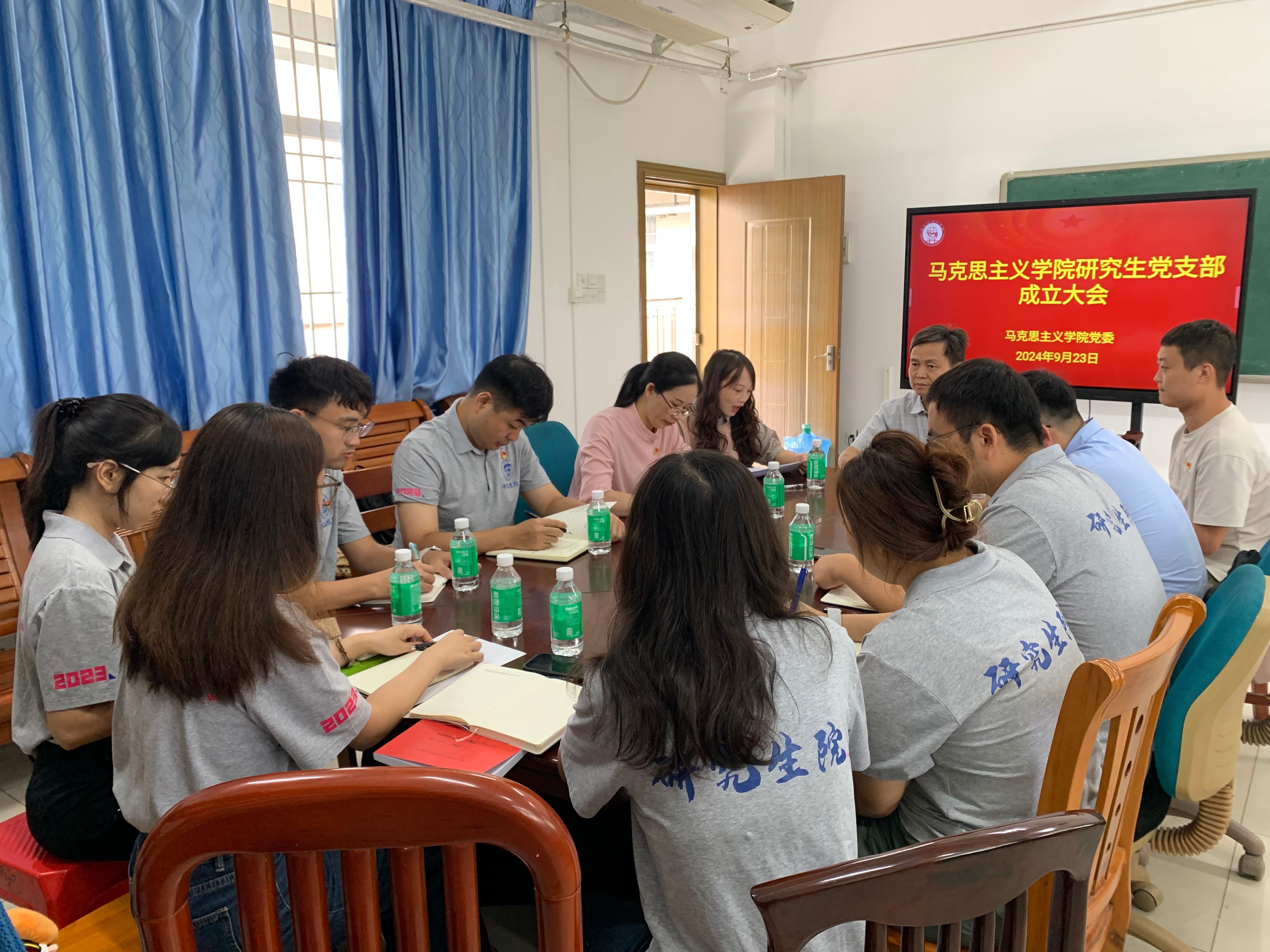本网讯 9月23日,我院在三教515办公室召开研究生党支部成立大会。学院党委书记侯玉基、专职组织员唐艳秋、23级研究生班主任王磊、24级研究生班主任谢乐以及全体研究生党员参加了会议,会议由研究生教学部主任陈碧娟主持。