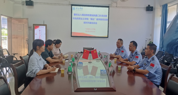 本网讯 10月31日下午,我院“概论”教学部教师党支部与肇庆出入境边防检查站执勤二队党支部在学院会议室举行了党支部结对共建洽谈会。我院院长、“概论”教学部教师党支部书记曹和修、学院党委副书记杜志欣、副院长林润燕、党支部支委聂丽容与肇庆出入境边防检查站执勤二队党支部书记梁少云、副书记张君帆、支委杜国亮参加洽谈。会议由我院院长、“概论”教学部教师党支部书记曹和修主持。