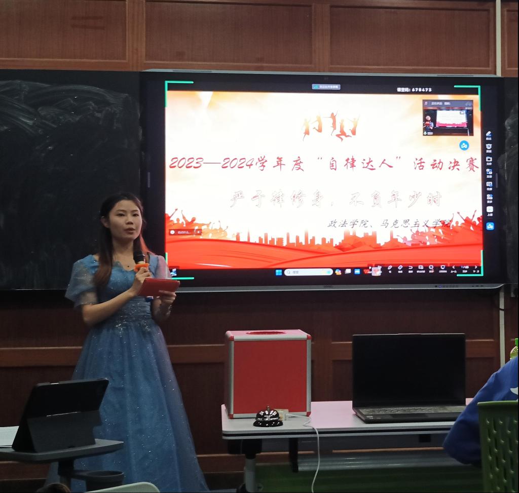 本网讯 严以律修身,不负年少时,风劲雨急亦不减热情,4月21日晚,由政法学院律委会和williamhill威廉希尔官网律委会联合举办的2024年“自律达人”决赛,通过线上线下相结合的方式举行。马院团委负责人陈炜琪、政法学院团委负责人黄健成,及两院团委、学生会、律委会主要学生负责人出席活动并担任评委。