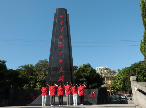 随后,队员们来到四会革命烈士纪念碑进行实地调研,同时组织开展了一次“祭扫烈士纪念碑,缅怀革命先烈”为主题的活动,通过凭吊革命先辈,向英勇献身的革命烈士表达崇高的敬意。在庄严肃穆的革命烈士纪念碑前,队员们整齐列队,向烈士默哀致敬,告慰烈士忠魂,寄托对烈士的无限哀思。在带队老师们的指引下,同学们奏唱国歌,并在纪念碑前重温了入团誓词,以表达对先烈们的深切哀悼和崇敬之情。