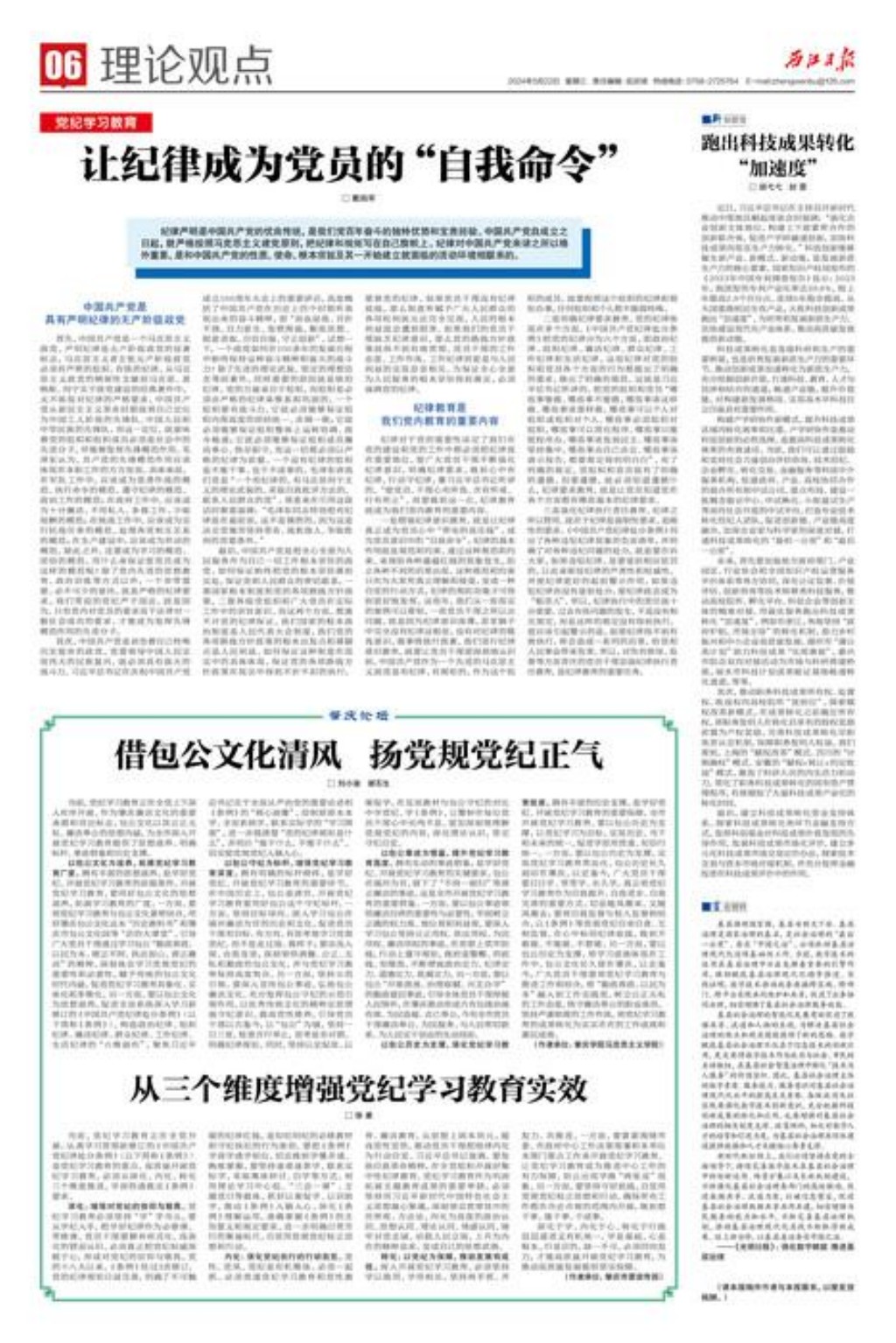 以包公文化为滋养,拓展党纪学习教育广度。拥有丰富的思想滋养,是学好党纪、开展党纪学习教育的前提条件。开展党纪学习教育,要用好包公文化的思想滋养,拓展学习教育的广度。一方面,要将党纪学习教育与包公文化紧密结合,用好肇庆包公文化这本“历史教科书”和肇庆市包公文化园等“活的大课堂”,引导广大党员干部通过学习包公“勤政善政、以民为本、刚正不阿、执法如山、清正廉洁”的精神,深刻体会学习党规党纪的重要性和必要性,赋予传统的包公文化时代内涵,促进党纪学习教育具象化、实体化和多维化。另一方面,要以包公文化为思想滋养,促进全面系统深入学习新修订的《中国共产党纪律处分条例》(以下简称《条例》),构造政治纪律、组织纪律、廉洁纪律、群众纪律、工作纪律、生活纪律的“六维画布”,聚焦习近平总书记关于全面从严治党的重要论述和《条例》的“核心画像”,绘制原原本本学、全面系统学、联系实际学的“学习图景”,进一步搞清楚“党的纪律规矩是什么”,弄明白“能干什么,不能干什么”,切实使党规党纪入脑入心。
