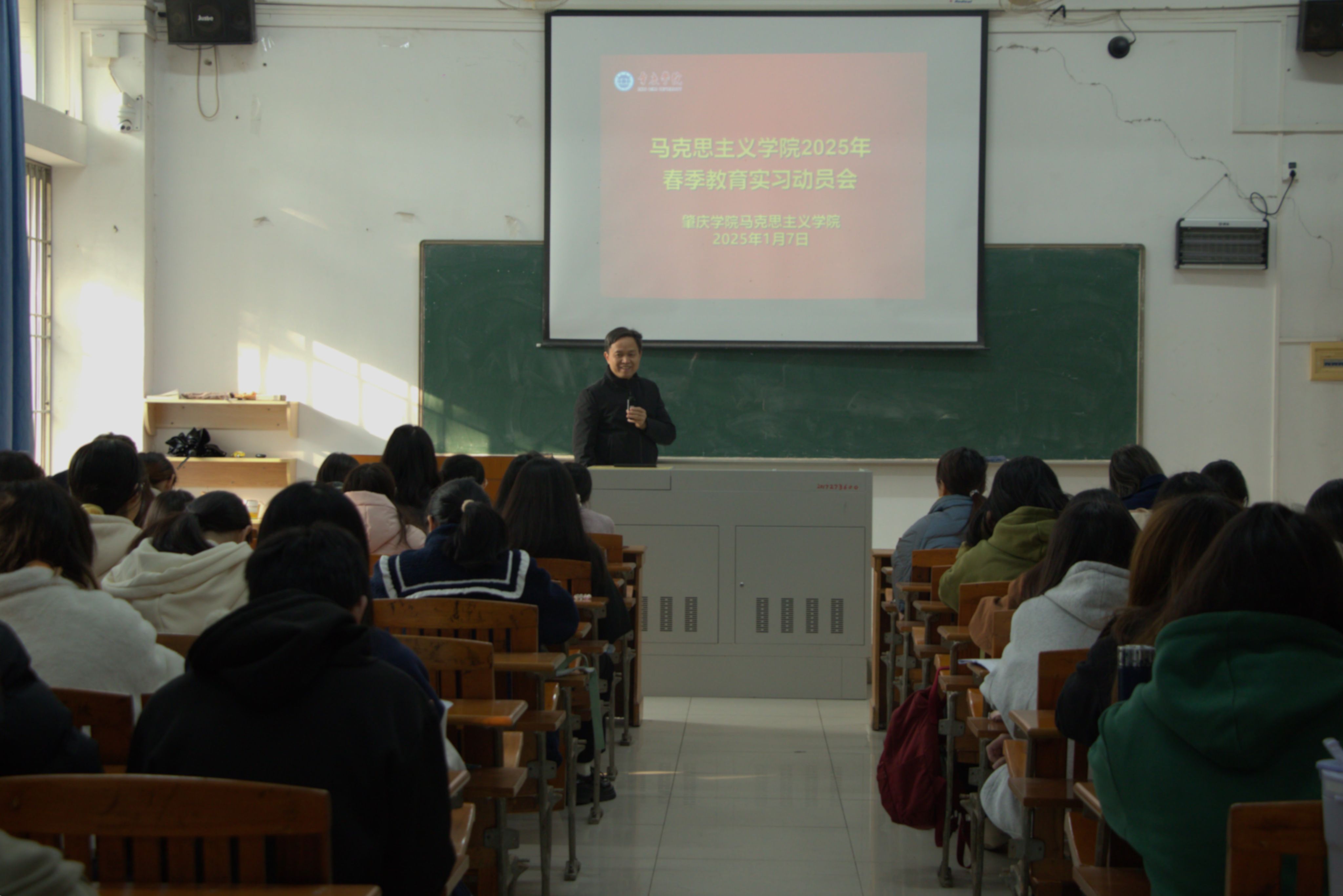 本网讯 1月7日,我院在第三教学楼101室举办2025年春季教育实习动员大会。学院党委书记侯玉基,党委副书记杜志欣,副院长林润燕,系主任高春海,班主任唐艳秋、来桂佩和实习指导老师们出席大会,往届优秀实习生代表邓惠怡、梁敏仪、朱如,2022级思想政治教育1、2班全体学生参加。