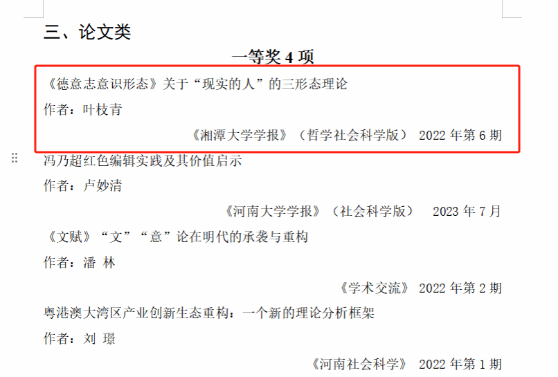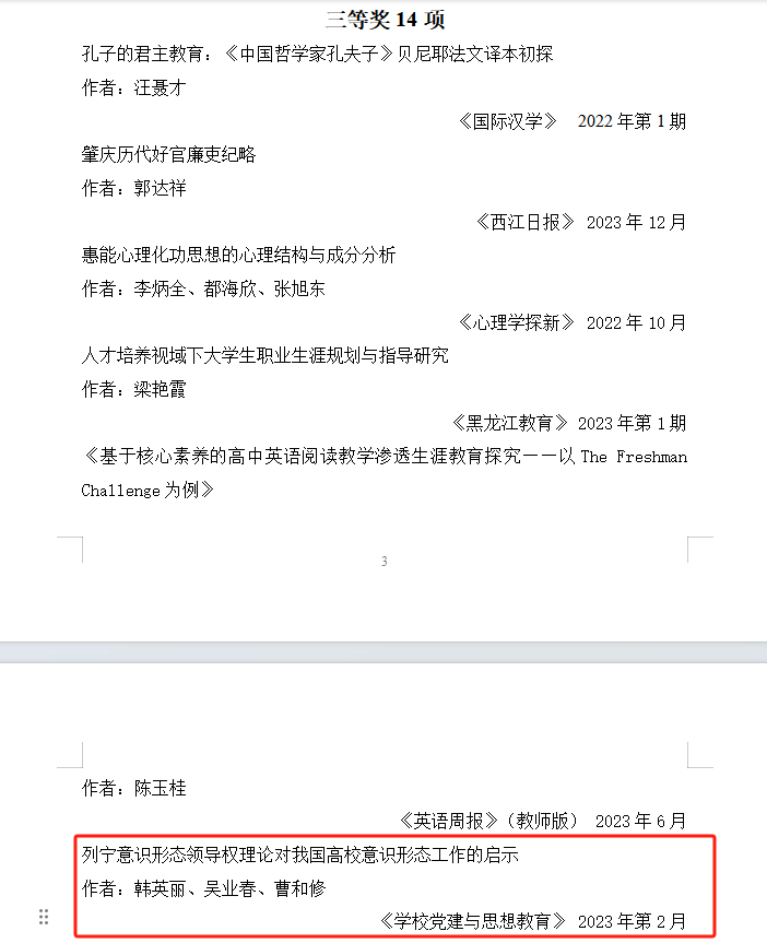 本网讯 近日,肇庆市第十七届(2022—2023年度)社会科学优秀研究成果评审结果公布,我院教师在论文类成果获奖共3项:一等奖1项、二等奖1项、三等奖1项。