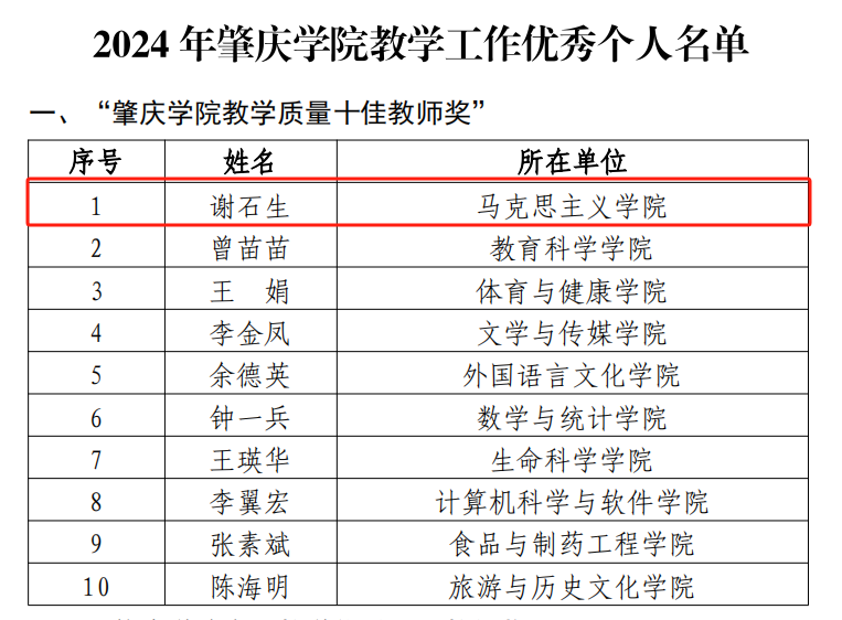 在2024年肇庆学院教学工作优秀个人表彰中,谢石生副院长因其深厚的学术造诣和卓越的教学工作,被授予“肇庆学院教学质量十佳教师奖”。