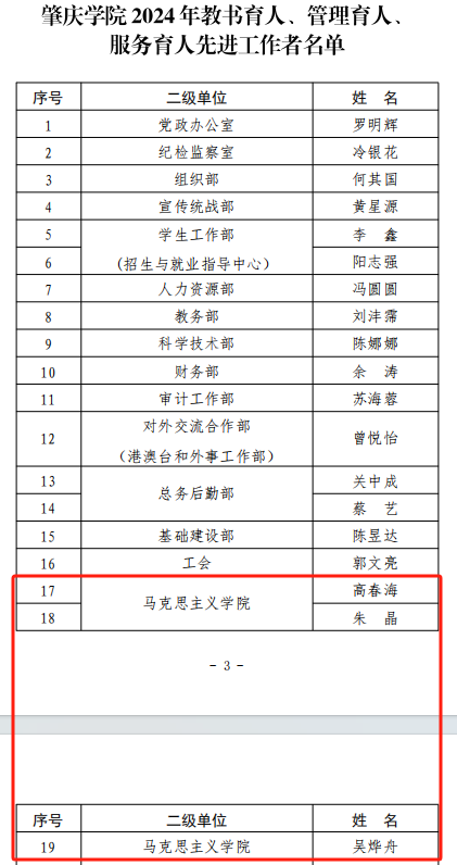 在肇庆学院2024年教书育人、管理育人、 服务育人先进工作者表彰中,我院高春海老师、吴烨舟老师、朱晶老师凭借过硬的思想政治素质和职业道德修养、卓越的教学科研能力和管理服务水平,荣获该年度荣誉表彰。