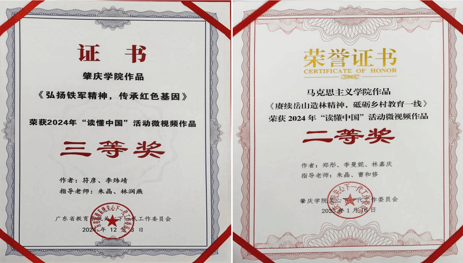在征文作品中,余阳洋同学的作品《老兵有志,愿军旗永远飘扬》(指导老师:朱晶 )荣获省级三等奖;余昱乐同学的作品《忠魂铸林海,青春颂山河》(指导老师:朱晶)荣获校级三等奖。微视频作品中,符彦、李炜靖同学的作品《弘扬铁军精神,传承红色基因》(指导老师:朱晶、林润燕)荣获省级三等奖;郑彤、李曼妮、林嘉庆同学的作品《赓续岳山造林精神,砥砺乡村教育一线》(指导老师:朱晶、曹和修)荣获校级二等奖。